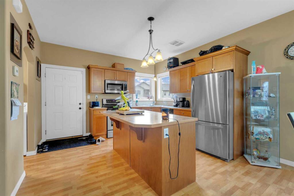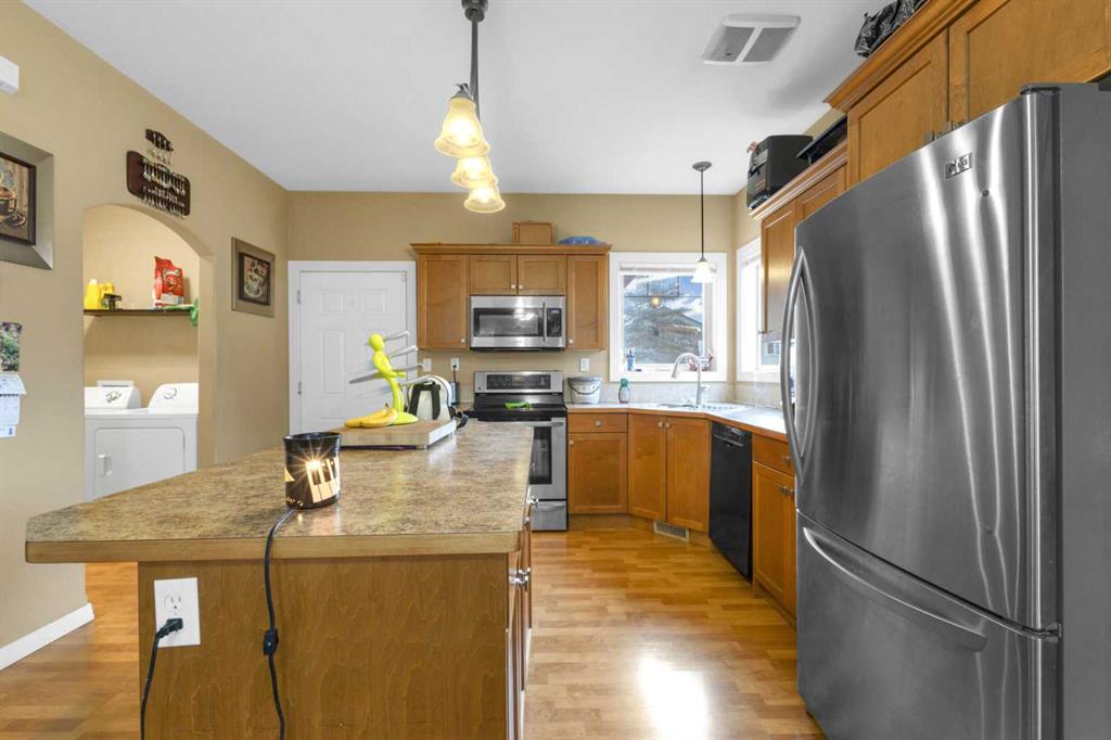 Welcome to #40 45 Ironstone Drive, a charming and bright 2-storey end-unit townhouse nestled beside a peaceful greenspace. This well-maintained 3-bedroom, 1.5-bath home offers a fantastic layout across two levels, perfect for families or anyone seeking comfortable living with plenty of natural light. The main floor features soaring 9-foot ceilings and an open-concept design. The kitchen shines with maple cabinets topped with crown mouldings, a corner sink, and a central island — ideal for cooking and entertaining. The adjacent eating area and spacious living room include a cozy gas fireplace and laminate flooring. Step out onto the deck from the living area, or take advantage of the convenient main floor laundry and a 2-piece powder room. Upstairs you’ll find three bedrooms, including a generously sized primary suite with vaulted ceilings, a large walk-in closet, and a “cheater” door granting direct access to the 4-piece bathroom. Two additional bedrooms offer flexibility for a growing family or home office needs. The basement awaits your personal touch and includes rough-ins for an additional bathroom. Additional perks include a single attached garage and recently updated appliances (2024). This bright, well-cared-for home combines comfort, style, and location — don’t miss your opportunity to make it yours!