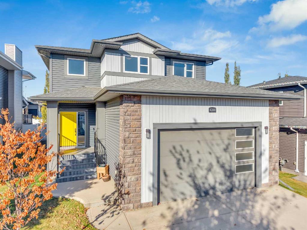 Welcome to 4288 Ryders Ridge Boulevard — a beautifully finished 2-storey home located in one of Sylvan Lake’s most sought-after family-friendly neighborhoods. This 4-bedroom, 3.5-bathroom home offers a thoughtful layout with high-end finishes and inviting spaces perfect for comfortable family living and entertaining. Step inside the spacious front entryway and be welcomed by an open-concept main floor filled with natural light from large west-facing windows. The living room is warm and inviting, featuring a gas fireplace with an elegant stone surround, ideal for cozy evenings. Rich hardwood flooring flows throughout the main level, enhancing the upscale feel of the home. The kitchen is a chef’s dream, showcasing upgraded dark-stained, ceiling-height cabinets with crown molding, granite countertops, a large island, stylish tile backsplash, and stainless-steel appliances. Adjacent to the kitchen is a generous dining area with direct access to the backyard – perfect for entertaining or enjoying sunsets in your west-facing, fully fenced backyard. Upstairs, a spacious bonus room provides flexible space for a home office, media room, or kids’ play area. The primary suite is a true retreat, complete with a spa-inspired ensuite featuring dual vanities, a soaker tub, separate water closet, walk-in tile shower with glass doors, and a large walk-in closet. Two additional bedrooms, both with walk-in closets, and a full bathroom complete the upper level. The fully finished basement adds even more living space with a large family room, wet bar, a fourth bedroom, a 4-piece bathroom, and ample storage. Additional features include main floor laundry, central air conditioning, a double attached garage (insulated and drywalled), vinyl fencing, landscaped yard, and a storage shed. Located in the heart of Ryders Ridge, you'll love being close to parks, playgrounds, walking trails, schools, and all the amenities Sylvan Lake has to offer – all within walking distance. This home is move-in ready and built to impress – don't miss your opportunity to make it yours!