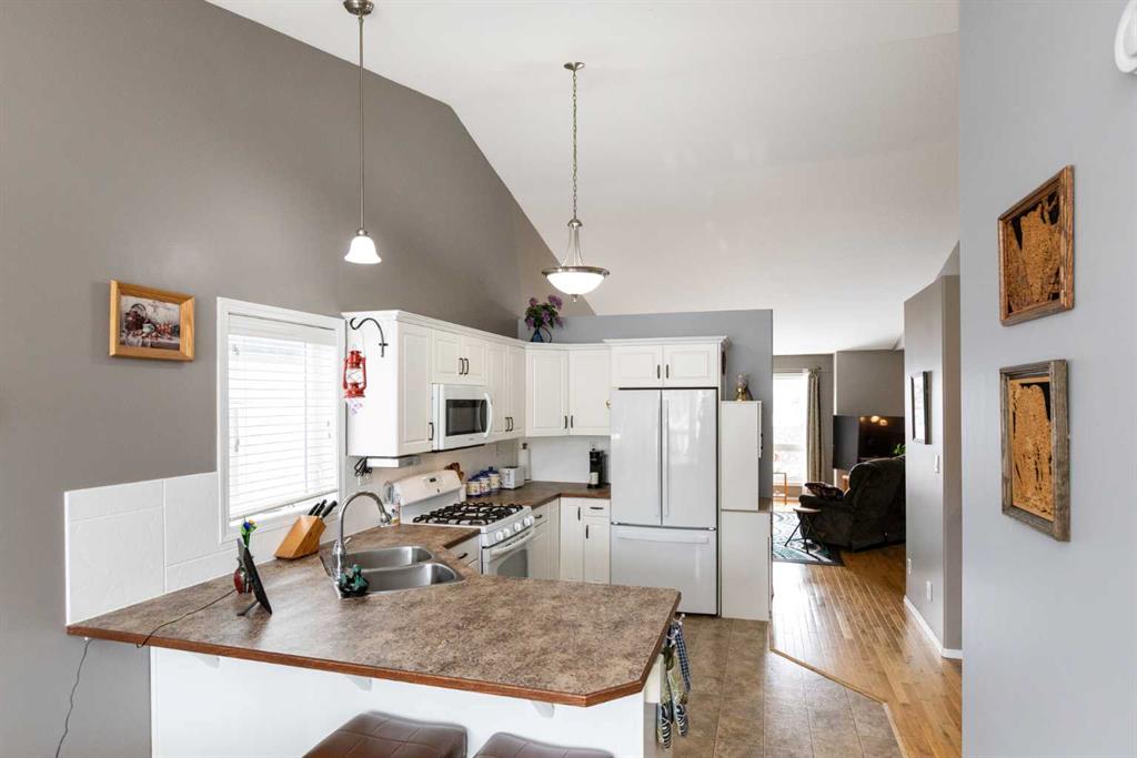 Welcome to this beautifully maintained bi-level in the growing community of Penhold, offering a functional layout, thoughtful updates, and excellent value. From the moment you arrive, the covered front porch sets the tone—perfect for morning coffee or unwinding at the end of the day. Step inside to a bright and inviting main floor featuring vaulted ceilings that enhance the sense of space and natural light. The kitchen is both practical and welcoming, complete with a pantry and adjoining dining area, making everyday living and entertaining effortless. The primary bedroom is privately located at the back of the home and features a spacious ensuite, creating a comfortable retreat. A second bedroom and full bathroom complete the main level. The recently developed basement adds impressive additional living space, highlighted by large windows and a generous recreation area. You’ll also find a third bedroom, full bathroom, and a versatile office that could easily function as a fourth bedroom, gym, or hobby space. Outside, enjoy a fully fenced yard with plenty of room for kids and pets, along with a rear deck ideal for relaxing or hosting. The double detached garage provides ample parking and storage. Situated in a quiet location within walking distance to local amenities, this home offers the perfect blend of small-town charm and everyday convenience.